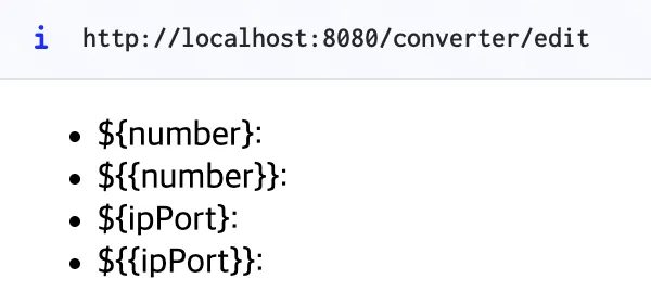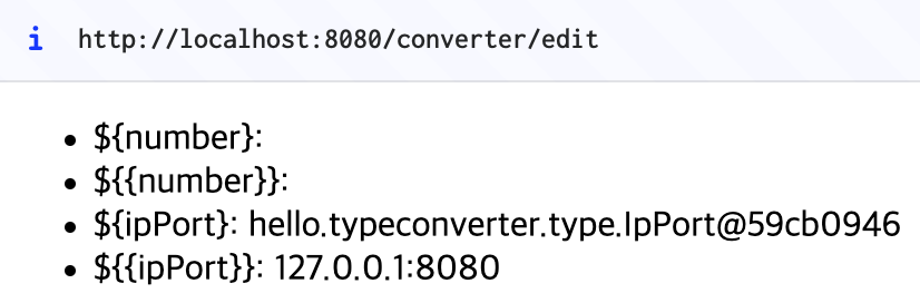 에 바인딩 하기 위해 일단 객체를 생성해야 된다. 이때 기본 생성자가 존재하지 않으므로 생성자를 호출할 때도 String -> IpPort 컨버터가 동작해야 된다. - (2회) 자바 빈 프로퍼티 규약에 의해 기본적으로 생성자 호출 -> setter 바인딩을 시도한다. 따라서 생성자 호출 때 컨버터가 호출되었더라도, setter 바인딩을 시도하면서 컨버터를 또 호출한다.