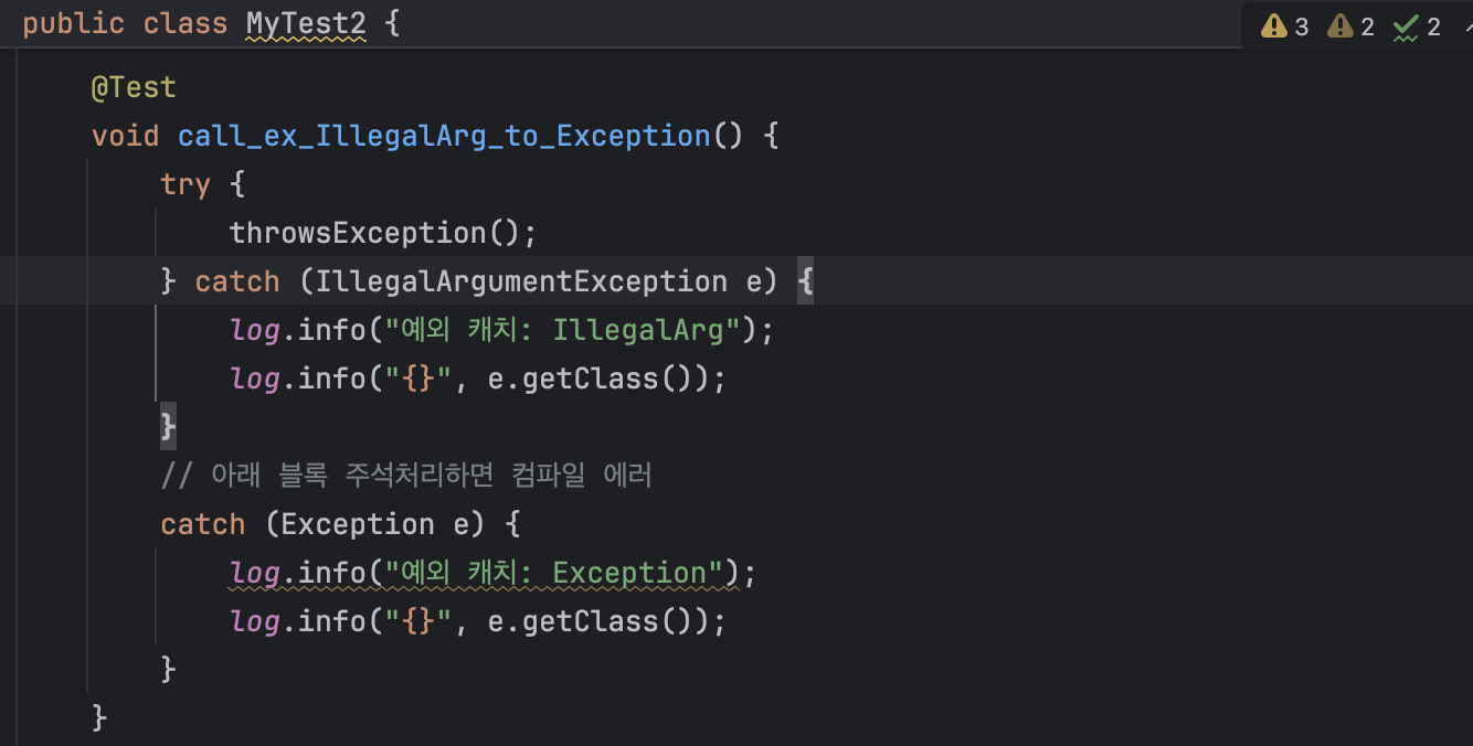 이전 케이스와 유사하지만, 예외가 발생하는 메서드를 호출하는 지점에서 catch