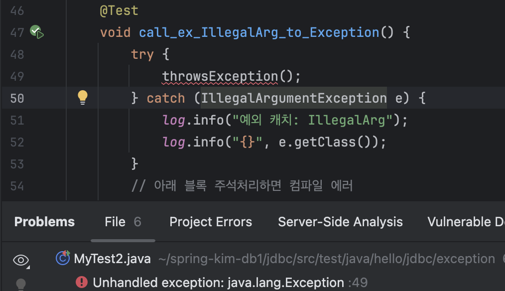 을 명시적으로 선언했을 때, 메서드 호출부에서 이를 처리하지 않으면 컴파일 에러가 발생합니다.위 문제 상황에 대한 인사이트를 얻을 수 있습니다.
